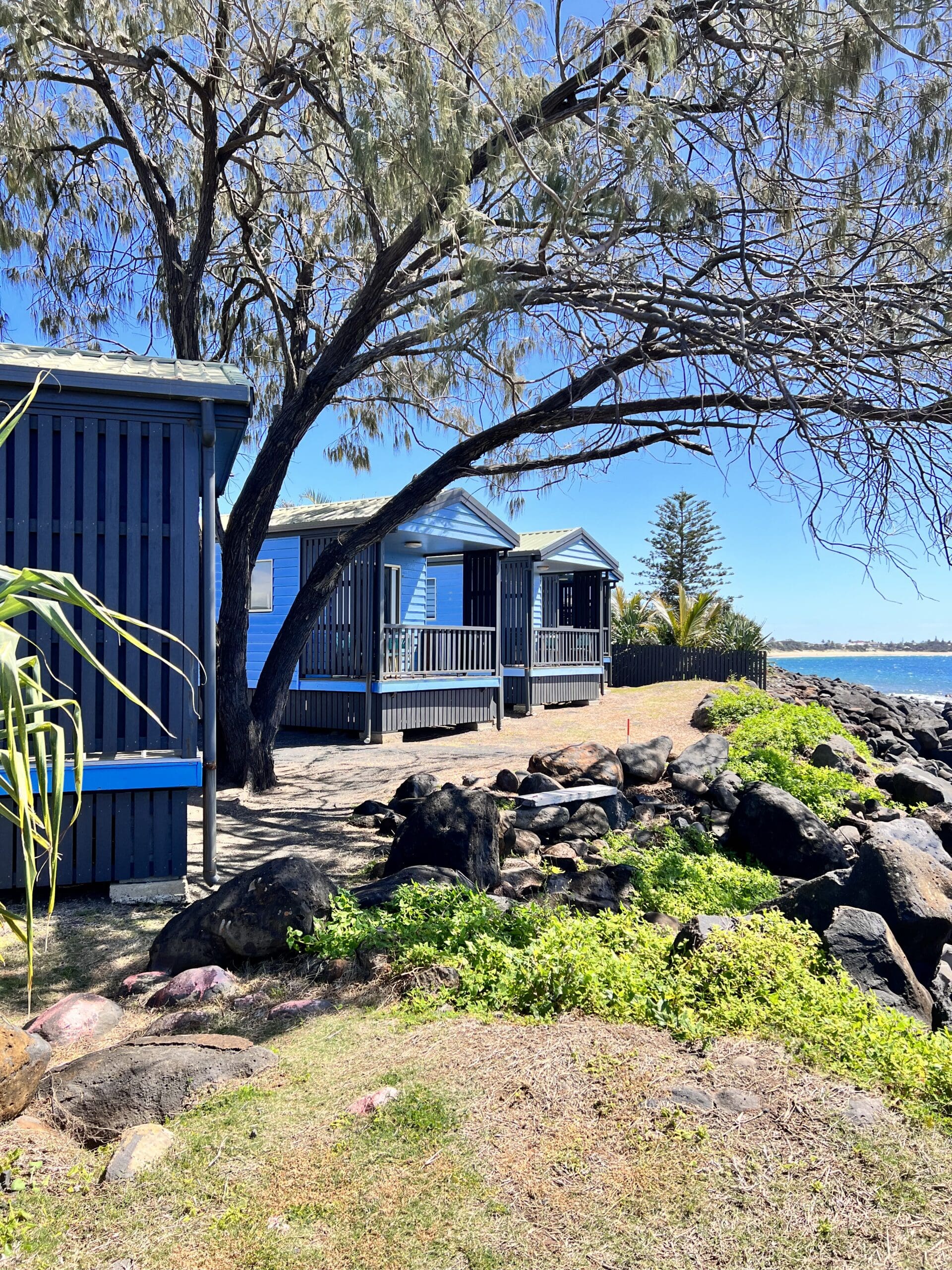 The park is situated right on the oceanfront with waves hitting a rock wall. The park is situated just South of Kellys Beach, a patrolled beach. Bargara Lakes Tavern is just 800 metres south down the road that serves reasonably priced meals and has a takeaway bottle-o attached. There is also a small takeaway fish & chip shop one block north of the park that sells bread, milk and papers as well as other convenience items.
